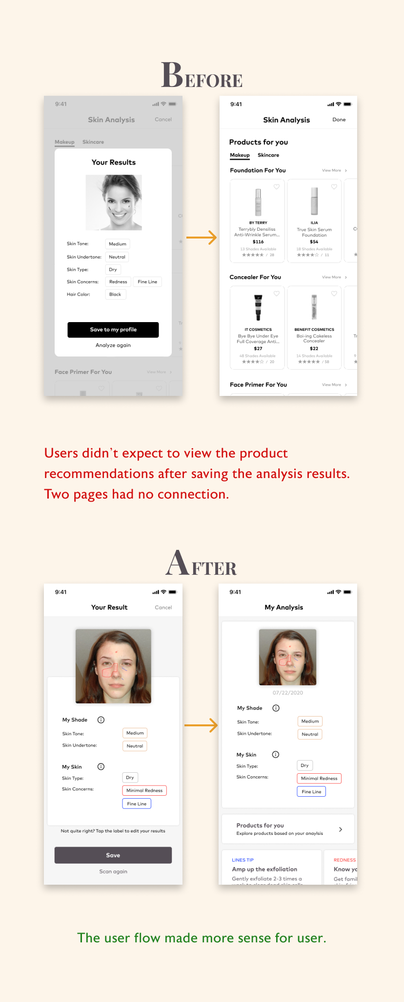 After completing skin analysis and saving it to the user profile, the user claims the screen should forward it to the profile page. The previous action is considered a profile update action. The new version of this user flow eliminates this confusion. After saving the results, the next screen users would see is the “My Analysis" page, which includes the skin analysis results, the link of product recommendations, and tips based on results. Users can view the analysis results on the account (profile) page.