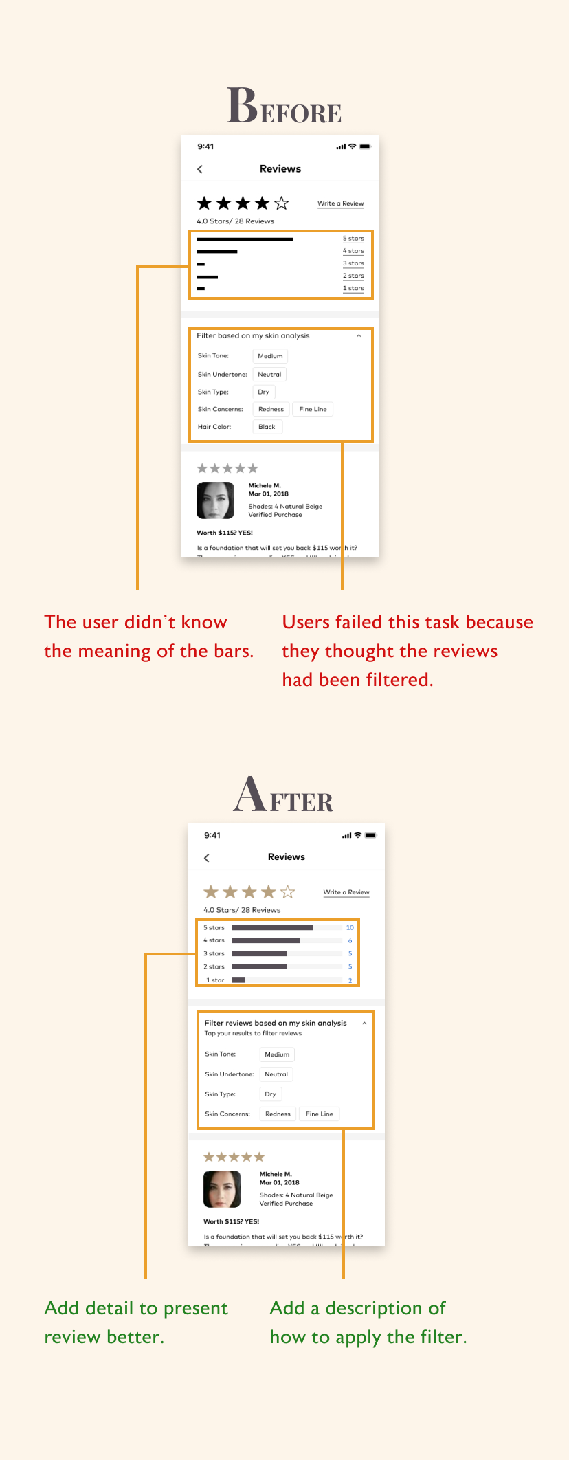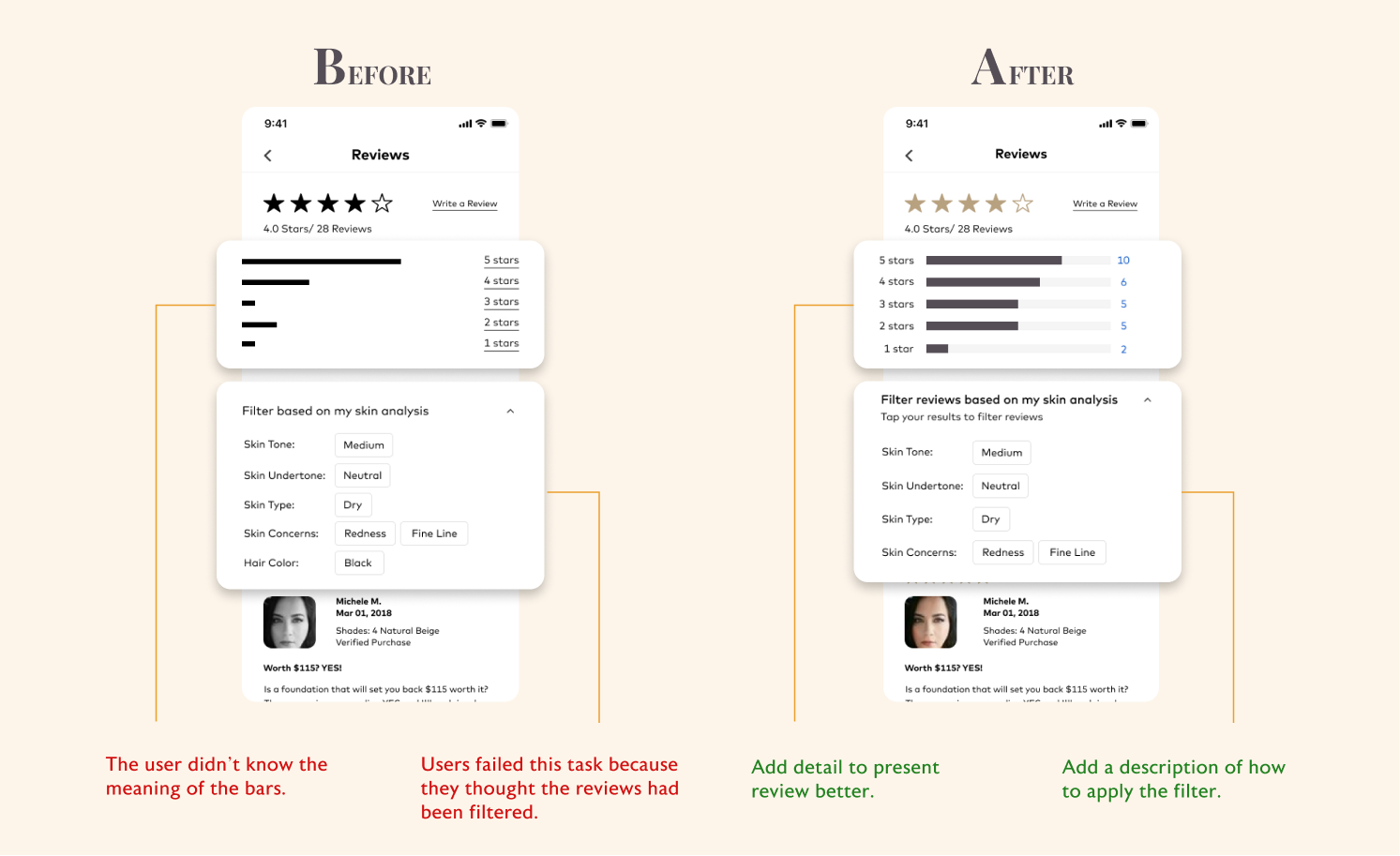 Two interviewees spent more than 40 seconds to understand and finish this task, and one interviewee failed this task because she thought the task had been completed. She assumed that the reviews had been filtered automatically after saving the skin analysis results. To solve this problem, I talked to users to understand their behavior when filtering products and their thoughts about this task. I finally decided to add a description that guides users on how to filter the reviews.