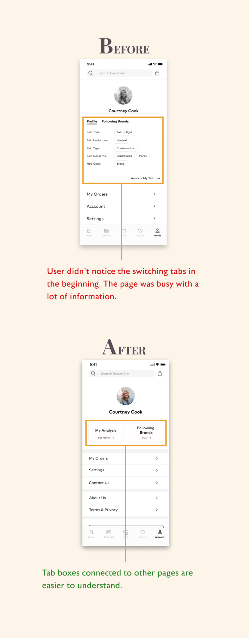 Two interviewees initially scrolled down the page and didn't notice tabs to change the pages. The user also mentioned that the "analyze my skin" button isn't apparent to tap. Besides, the page looks busy with a lot of information. In the new design, I replaced the switching tabs with two tab buttons with copy such as "see results" and "view," and each tab box connected to different pages. I also renamed the profile page to the account page because it shows more than just its profile.