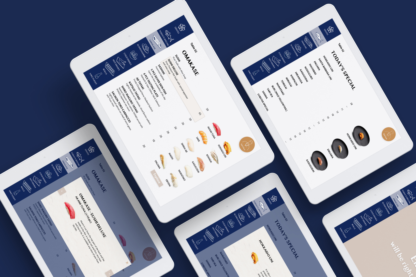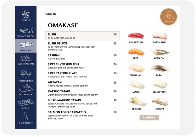 Customers can explore the name and information about the fish and omakase< sets on the interactive menu. It creates a fun interaction with the customers and helps them understand the fish they are having and why the chef serves the nigiri that way.