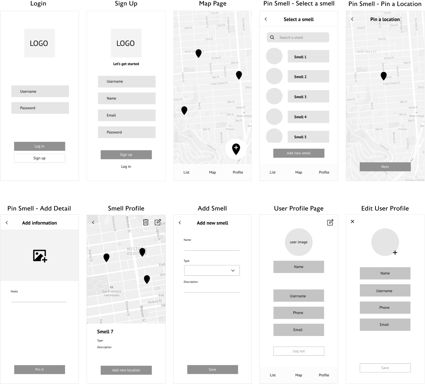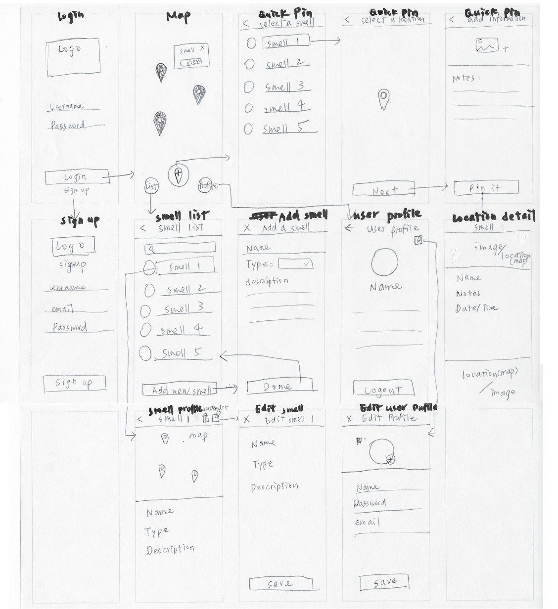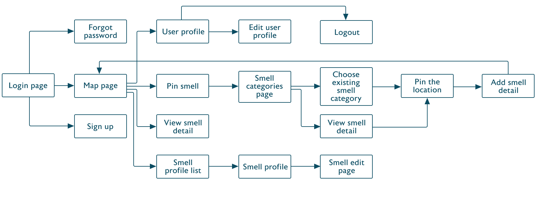 I started by mapping out the app structure. Map page would be the landing page after the user log in the account, and the user could select pin smell, see user profile, or view the map page's smell list to complete their goals.