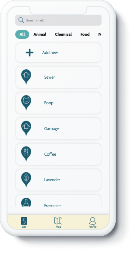 By adding the filter tabs on the smell list page, the user can easily sort all the smells by the smell types.