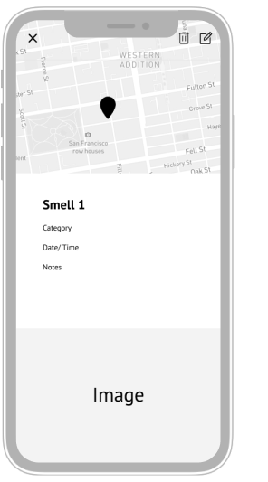 In the initial, I presented the menu as a button format on the map page. The user can also view the images and notes for each smell's location on the location detail page. This function achieves the product goal - enhance the user's olfactory experience by tracking the smell on the street.